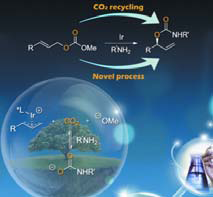 CO2不仅是导致温室效应的气体,同时也是很重要的一碳来源,其在高附加值精细化学品的合成方面具有重大的应用前景。然而CO2是惰性的,这给其在有机合成上的应用带来巨大困难。尤其,区域或对映选择性地将CO2导入有机分子骨架上一直是合成化学上的一大挑战。 我系赵晓明教授研究小组发现金属铱和Feringa配体组成催化剂,在磷酸钾存在下,该催化剂成功地催化了烯丙基碳酸甲酯与胺的串连反应;高区域、高对映选择性地合成了胺基甲酸酯化合物。这类化合物具有潜在的生物活性,因为农药如西维因、速灭威等是胺基甲酸酯衍生物。 研究表明:烯丙基碳酸甲酯与铱络合物进行氧化加成反应, 生成烯丙基铱络合物并释放CO2,然后胺捕捉CO2,再与烯丙基铱络合物反应生成目标化合物。这是过渡金属不对称催化烯丙基化反应领域循环使用CO2的第一个例子。该工作已在《欧洲化学》期刊(Chemistry - A European Journal)上作为亮点文章(a Frontispiece paper)发表 (Chem.-A Eur. J.2014,20, 7216-7221, IF: 5.73); 同年ChemistryViews对该工作进行了积极评述(ChemistryViews,2014)。