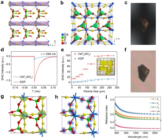 研究团队还运用密度泛函理论方法结合材料单晶结构X射线衍射分析进行理论模拟计算,进一步探讨并阐明了CeF2(SO4)具有强倍频效应和大双折射率同步增益的内在物理机制,提出了有利于获得较大倍频效应和双折射率增益的主要原因是高极化氟化铈氧多面体[CeO4F4]的引入以及稀土金属多面体与[SO4]2-四面体基元的最优有序排列和密集堆积。该高价稀土金属铈氟代硫酸盐晶体CeF2(SO4)表现出强的倍频效应(8.0 × KDP),其倍频强度为目前已发现的无机硫酸盐体系最大值;CeF2(SO4)的双折射率(0.361 @ 546 nm)超过了目前已报道氧化物双折射率的极限值。该研究为新型高性能非线性光学晶体材料的设计创制提供了一个全新的示范。