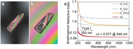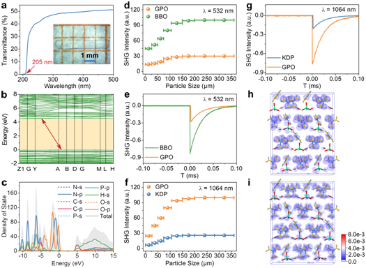 研究团队还通过单晶结构分析并结合第一性原理理论模拟计算,进一步探讨并阐明了GPO可实现倍频效应、双折射率、透光范围三者同步优化增益的内在物理机制,阐释了有利于获得强倍频效应-适中双折射率-宽透光范围的主要原因是有机π共轭阳离子[C(NH2)3]+的引入及其诱导阴离子[PO4]3−基团的有序排列。该胍磷酸盐晶体GPO表现出短的紫外吸收截止边(205 nm),适中的双折射率(0.078 @ 546 nm),GPO的理论计算I型最短相位匹配波长在250 nm处;GPO同时具有强的倍频效应(3.8 × KDP @ 1064 nm;0.3 × β-BaB2O4 @ 532 nm)。该研究为探索紫外日盲波段下二阶非线性光学晶体材料提供了一种全新的思路。