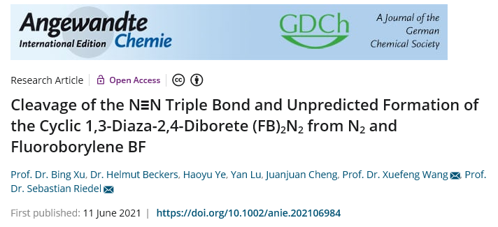近日,公司王雪峰教授、许兵副教授课题组在氮气活化方面的研究成果“Cleavage of the N≡N Triple Bond and Unpredicted Formation of the Cyclic 1,3-Diaza-2,4-Diborete (FB)2N2 from N2 and Fluoroborylene BF”作为热点文章在国际知名期刊《德国应用化学》上发表。