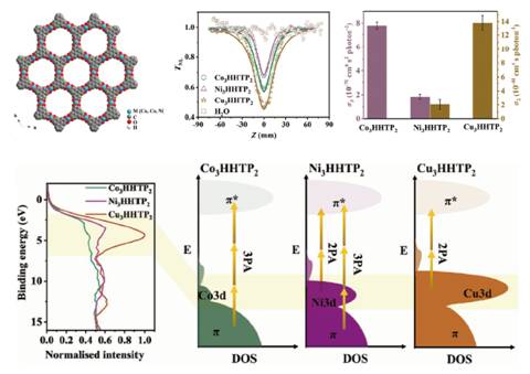 研究团队还构筑系列金属有机框架材料(M3HHTP2; M=Co, Ni, Cu; HHTP= 2,3,6,7,10,11-hexahydroxytriphenylene)作为非线性吸收材料,通过过渡金属d轨道电子数量调控非线性吸收特征和性能。在532nm激光激发下,随着过渡金属3d轨道电子数量的增加,材料非线性吸收由三光子吸收逐渐转化到双光子吸收。相关成果“Superb Nonlinear Absorption of Triphenylene-Based Metal–Organic Frameworks Associated with Abundant Metal d Electrons”日前发表于Advanced Optical Materials, 2021, 9, 2100622。
