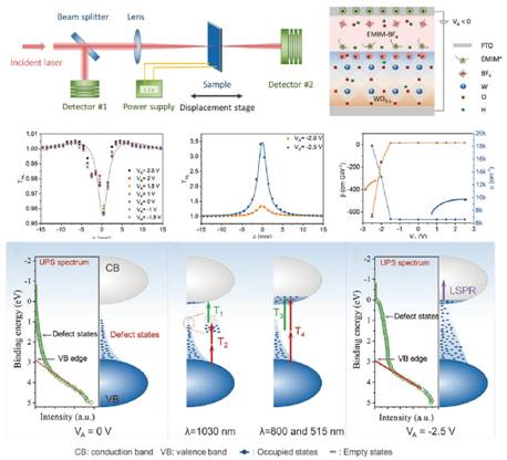 通过施加电压调控氧化钨(WO3-x)薄膜中W的价态,可诱导薄膜体现饱和吸收和反饱和吸收等截然不同的非线性光学响应特征。在1030nm激光激发下,薄膜非线性吸收系数可达‒632cm GW-1(‒2.5 V电压),是未处理样品非线性吸收系数(18 cm GW-1)的35倍。同时在800nm和515nm激光激发下,氧化钨薄膜也体现出电压相关的非线性吸收行为。薄膜非线性吸收性能的调控源于与W相关的带间缺陷态位置和数量变化。相关成果“Switching the Nonparametric Optical Nonlinearity of Tungsten Oxide by Electrical Modulation”日前发表于光学材料领域重要期刊《先进光学材料》(Advanced Optical Materials, 2021, 9, 2002188)。