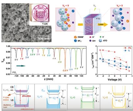 在1030nm激光激发下,掺锑氧化锡(ATO)薄膜的五阶非线性吸收系数可由外压控制在0.51~3.46cm3GW-2之间连续调控。五阶非线性吸收行为源于纳米颗粒内部双光子吸收-激发态吸收的连续非线性吸收过程。外加电压可通过静电作用调制ATO纳米颗粒的能带弯曲程度和非耗尽层尺寸,从而使纳米颗粒在不同电压下体现不同的光学活性区域体积以及非线性吸收性能。相关成果以 “Electrical Tuning of the Fifth-Order Optical Nonlinearity of Antimony-Doped Tin Oxide”为题发表于Advanced Optical Materials, 2021, 9, 2001357。