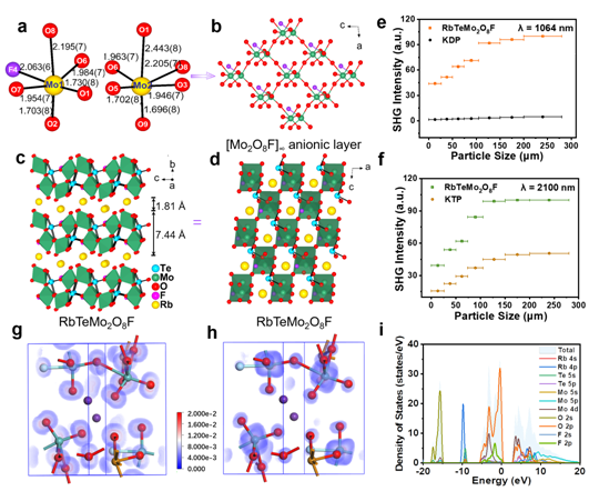 在这一研究中,研究团队提出了一种部分氟取代策略,以增加孤对氧阴离子基过渡金属氧化物的结构畸变。他们通过用电负性更高的氟离子来取代结构中一半过渡金属中心八面体上的一个氧位点可导致费米能级附近电子态密度的改变从而实现光学带隙的提升,同时产生了层状结构中两种均匀交替连接的极化[MoO5F]和[MoO6]八面体,其中氟离子作为结构导向因子,使得层状结构中共边连接的[TeO4]多面体上的孤对电子优先朝一个方向排列,从而形成具有最大化倍频活性的宏观极性化合物。基于这一部分氟取代的策略,成功设计合成了第一例由三种倍频活性基元[MoO5F]/[MoO6]八面体和[TeO4]多面体组成的二维结构部分过渡金属中心八面体氟代亚碲酸盐晶体材料。在此基础上,运用X射线衍射单晶结构分析并结合密度泛函理论方法进行模拟计算,进一步探讨并阐明了RbTeMo2O8F的倍频效应和光学带隙同步增益的内在物理机制,提出了有利于获得强倍频效应和宽光学带隙的主要原因是高电负性氟离子的引入(部分氟代)以及三种极化活性单元[MoO5F]/[MoO6]八面体和[TeO4]多面体的最优有序排列和密集堆积。该部分过渡金属中心八面体氟代亚碲酸盐RbTeMo2O8F表现出可见和中红外波段巨大的倍频效应(27 × KDP @ 1064 nm;2.2 × KTP @ 2100 nm),其倍频强度为目前已发现的无机亚碲酸盐体系最大值;RbTeMo2O8F的光学带隙(3.63 eV)超过了目前绝大部分已报道的过渡金属亚碲酸盐。该研究为新型高性能非线性光学晶体材料的设计创制提供了一个全新的示范。