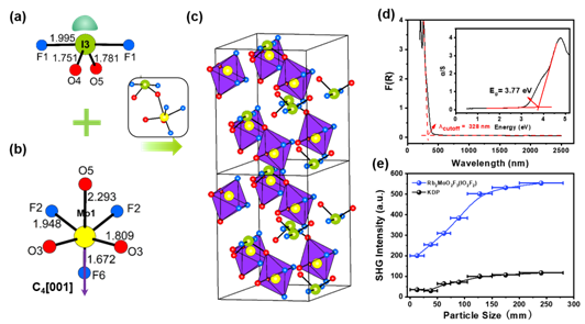 非线性光学晶体材料是应用激光频率转换技术实现激光器光源向未开发波段扩展的关键性元件,其中中红外(3-5 μm)激光材料在激光医疗、军事通讯、半导体光刻等众多先进激光技术领域具有重要的科学价值和广阔的应用前景。目前,硫族化合物AgGaS2、AgGaSe2和ZnGeP2作为商业化的中红外非线性光学晶体具有优越的倍频效应和红外透射范围,但普遍存在着带隙窄、激光损伤阈值低和双光子吸收等缺点,严重限制了它们在高端激光技术中的实际应用。而基于孤对电子氧阴离子的金属氧化物往往表现出较大的激光损伤阈值和良好的晶体生长习性,却无法同时满足强倍频效应(>10 × KDP)和宽光学带隙(>3.5 eV)两个相互矛盾的固有结构性要求,因此如何获得倍频效应和光学带隙同步显著优化增益的氧化物晶态材料是当前中红外非线性光学材料研究中的一个极具挑战的科学难题。