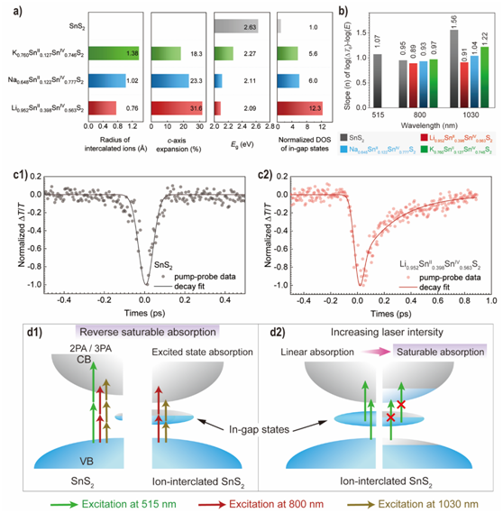 图4. (a) 插层产物c轴间距膨胀、带隙和缺陷态密度与离子半径的关系,(b) 非线性吸收幅度与激发光强关系的斜率,(c1,c2) 泵浦探测曲线,(d1-d3) 缺陷调控非线性吸收过程的机理。