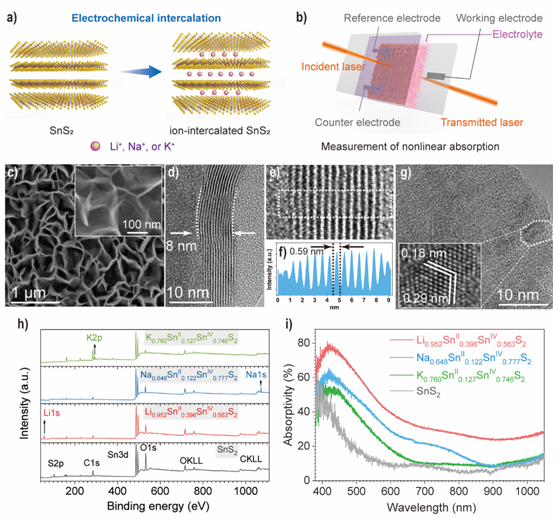 图1. (a) SnS2插层模型,(b) 性能研究装置示意图,(c-g) SnS2形貌结构表征及插层产物的 (h) XPS和 (i) 线性吸收光谱表征。