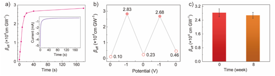 图3. (a) 非线性吸收系数与电化学插层时间的关系,(b) 非线性吸收系数的离子插层/脱嵌循环调控过程,(c) 插层产物非线性吸收性能的时间稳定性。