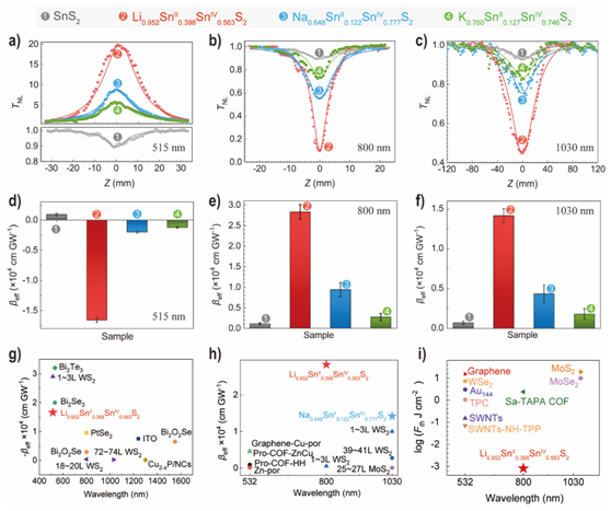 图 2. (a-c) 不同激发波长下SnS2及插层产物的Z-扫描曲线、(d-f) 非线性吸收系数及其 (g-h)与其它无机半导体材料性能的对比。