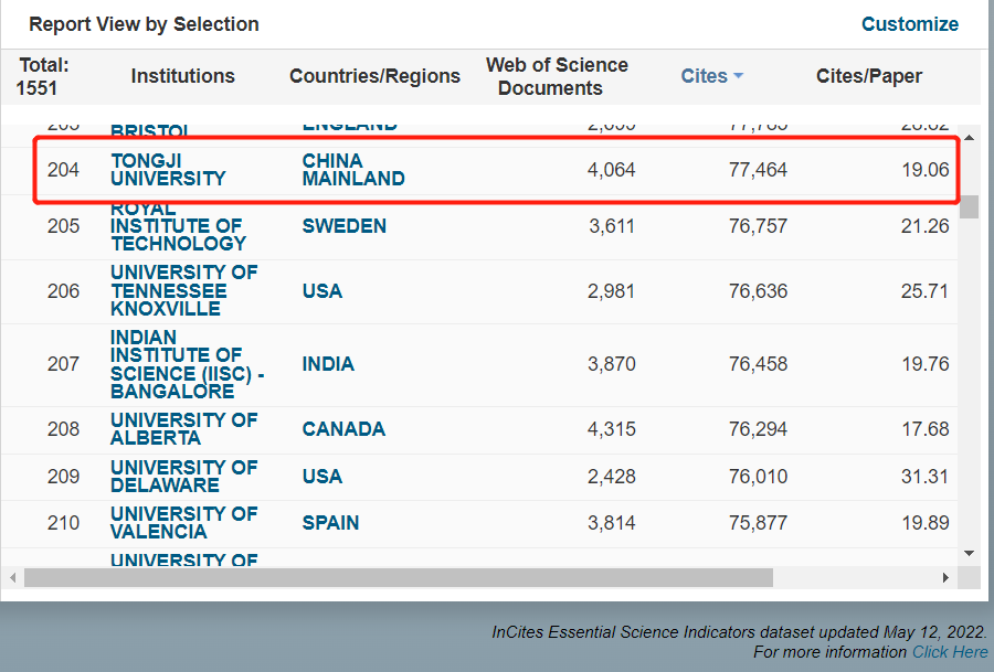 2022年5月最新ESI国际排名发布,同济化学学科排名第204位