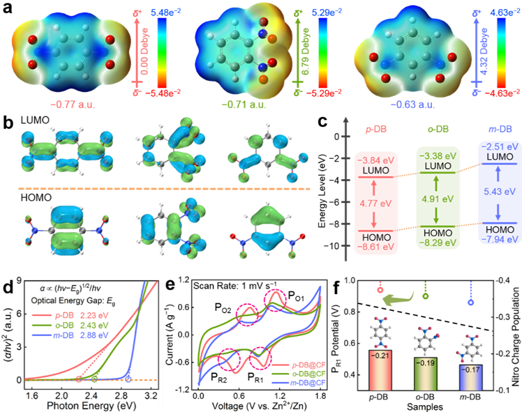 理论计算和实验结果表明,硝基在苯环上的组分异构效应是导致硝基芳烃化合物电子结构、能带间隙和氧化还原活性差异的主要原因。得益于对称和稳定的分子结构,对二硝基苯(p-DB)展示出更高的亲锌活性和更高的还原电位,有助于加快电子转移和提高氧化还原动力学。