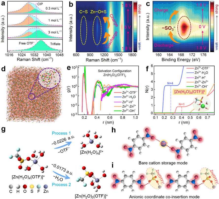 分子动力学模拟和拉曼光谱研究表明,OTF−阴离子参与了Zn2+的溶剂化过程,两者以Zn(OTF)+形式与硝基发生氧化还原反应实现储能。独特的阴离子共嵌插机制避免了相邻硝基芳烃分子结构重排以平衡Zn2+,有效降低了离子的扩散迁移势垒,提高了电池的倍率性能和循环稳定性。