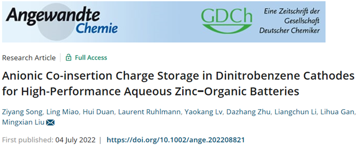 近日,公司刘明贤教授研究团队报道了二硝基苯作为锌-有机电池阴极材料,揭示了硝基芳烃阴极中阴离子共嵌插电荷存储机制,促进硝基位点的高效利用和低反应能垒的快速氧化还原速率,实现了水系锌-有机电池高比容量和长循环寿命协同输出。相关成果“Anionic Co-insertion Charge Storage in Dinitrobenzene Cathodes for High-Performance Aqueous Zinc−Organic Batteries”以Research Article的形式在线发表于化学领域著名的国际学术期刊《德国应用化学》(Angewandte Chemie International Edition, 2022, https://doi.org/10.1002/anie.202208821)。