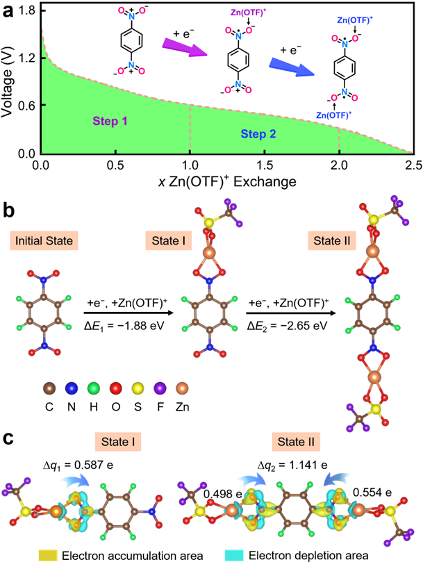 水系锌离子电池由于采用具有理论比容量高、环境友好和资源丰富等优势的锌金属阳极以及安全性好的水系电解液,是近年来备受关注、极具竞争力的储能器件之一。锌-有机电池基于有机阴极的活性基团与电解液离子的可逆氧化还原反应实现储能,其活性官能团主要包括羰基、氰基、亚胺和氮自由基。然而,由于这些基团电活性不足且易溶解于电解液中,致使器件面临比容量不高和循环寿命不足两大挑战。因此,亟需开发新型高活性有机阴极材料,以进一步提升器件的储能性能。研究团队报道了高活性二硝基苯分子作为锌-有机电池阴极材料,揭示了硝基芳烃阴极中阴离子共嵌插电荷存储机制,实现了硝基活性位点的高效利用和低反应能垒的快速氧化还原速率,赋予水系锌-有机电池高比容量和长循环寿命。