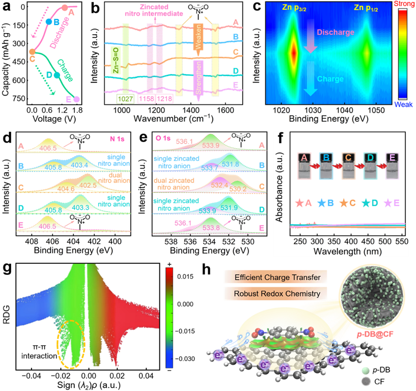 异位光谱研究表明:i)硝基官能团作为电活性中心引发了高度可逆的氧化还原反应;ii)基于锌离子与硝基氧(去)配位,硝基芳烃阴极经历了两步连续的电荷存储过程。紫外光谱和RDG模拟揭示了硝基芳烃分子与碳载体的弱π–π相互作用,赋予硝基芳烃@碳复合阴极优异的结构稳定性和反应动力学。
