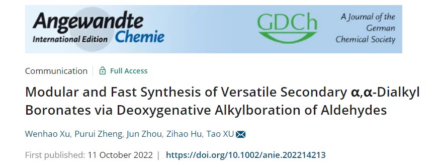 日前,公司徐涛教授课题组利用广泛存在或者合成易得的醛作为反应前体,通过脱氧烷硼化策略实现了二级烷基硼化合物的高效合成,提供了一种崭新的合成思路。相关成果“Modular and Fast Synthesis of Versatile Secondary α,α-Dialkyl Boronates via Deoxygenative Alkylboration of Aldehydes” 在线发表于化学领域著名国际学术期刊《德国应用化学》(Angewandte Chemie International Edition, 2022,e202214213)。