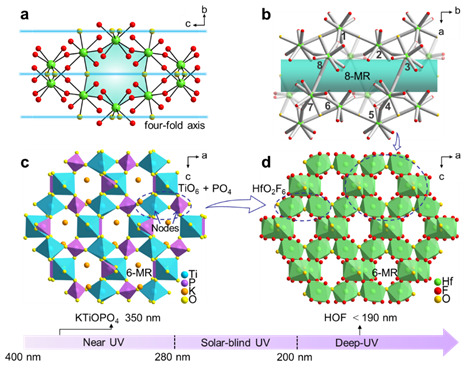 在这项研究中,研究团队首次提出了“等网络分子设计”策略,以著名的商业化二阶非线性光学晶体磷酸钛氧钾KTiOPO4 (KTP)为结构模型,通过改变KTP三维结构中功能网络节点的过渡金属多面体基元种类,将有效电负性低的d0过渡金属中心基元[MO2F6] (M = Zr, Hf)取代经典KTP结构中的[TiO6]和[PO4],创制了第一例具有类KTP结构构型的d0过渡金属氧氟化物ZOF和HOF。相比于过渡金属[TiO6]多面体基元,ZOF和HOF中的过渡金属锆/铪阳离子中心基元具有高的氧氟比;与高价过渡金属多面体基元相比,四价d0过渡金属锆/铪阳离子具有较低的有效电负性,可以有效地阻碍金属多面体中氧/氟-金属的电荷转移。在此类金属多面体体中引入电负性最大的氟原子,并尽可能增加金属多面体中F/O比,会显著改变材料的电子能带结构,为其紫外吸收截至边的蓝移提供了极大的可能性。尤为重要的是,d0过渡金属中心多面体的长程有序的微观排列方式有利于材料表现出强的二次谐波效应。