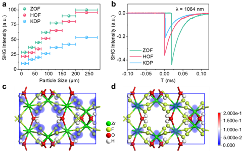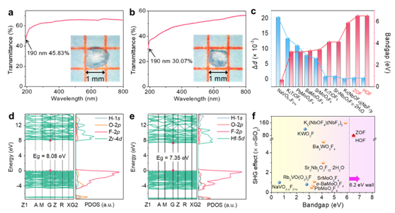 研究团队还运用单晶结构X射线衍射分析结合第一性原理理论进行模拟计算,深入探讨并阐明了ZOF和HOF中带隙的极大增益可归因于d0过渡金属多面体[MO2F6] (M = Zr, Hf)基元的高度氟化和金属中心的低电负性。实验研究显示,ZOF和HOF具有良好的物化稳定性,其紫外吸收截止边均小于190 nm,该氧氟化物在1064 nm波长下表现出强的粉末倍频响应(2.2 × KDP (ZOF)和1.8 × KDP (HOF)),并且能够实现相位匹配。该项研究对于创制研发新型高性能深紫外二阶非线性光学晶态材料具有重要的科学意义和示范作用。