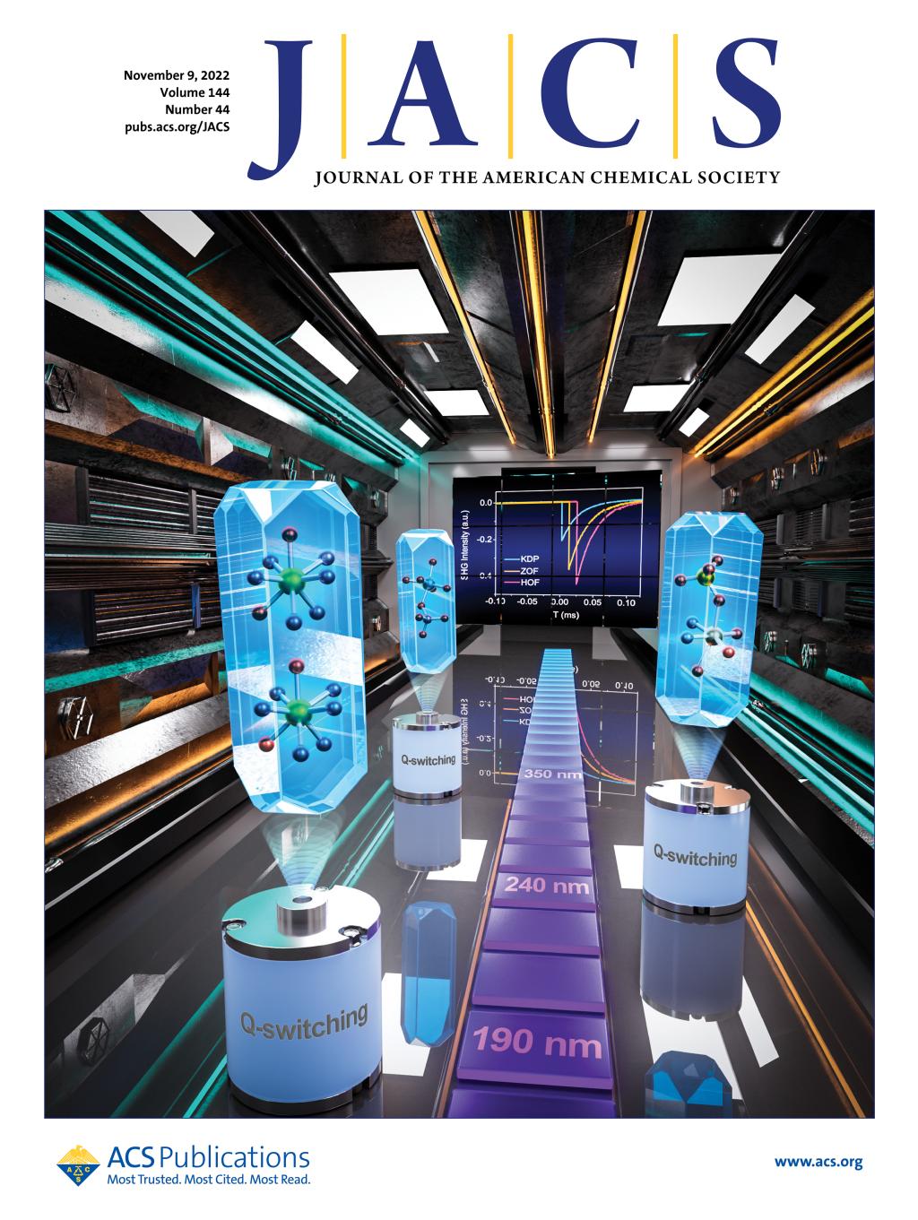 欧洲科学院院士、公司经理张弛教授研究团队以d0过渡金属氧氟化物为研究对象,提出了一种“等网络分子设计”策略,创制了首例深紫外透过的d0过渡金属氧氟化物晶态材料MOF4H2 (M = Zr (ZOF), Hf (HOF)),探讨并阐明了该氧氟化物可实现带隙和倍频效应同步增益的物理机制。相关成果“Isoreticular Design of KTiOPO4-like Deep-Ultraviolet Transparent Materials Exhibiting Strong Second-Harmonic Generation” (等网络设计强二次谐波产生的KTiOPO4构型深紫外透过材料)今日以全文(Article)的形式发表在国际化学领域最重要的学术期刊《美国化学会志》(Journal of the American Chemical Society, 2022, 144(44), 20394-20399)上,并因研究工作的重要创新性和同行专家的高度认同而被JACS编辑委员会遴选为期刊最新一期的封面文章。