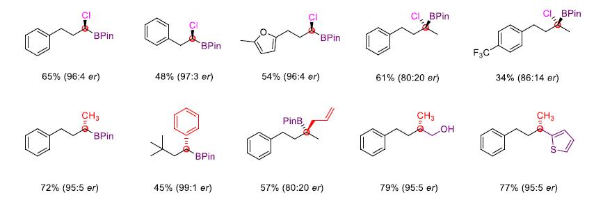 值得一提的是,该反应可以通过手性催化成功地实现了羰基的对映选择性氯硼化,得到了手性的三取代、四取代α-氯代硼酸酯,并且其可只需一两步就可以很便利地实现醛的多种双官能团化,凸显了该方法在有机合成中的巨大潜力。