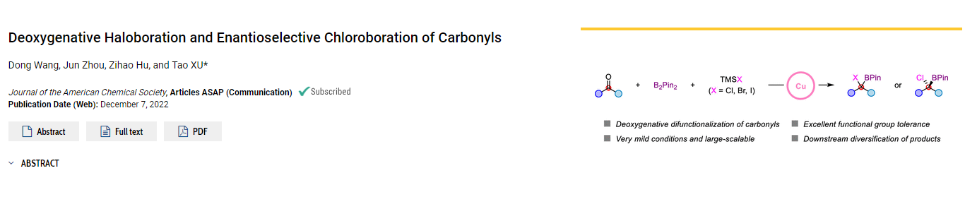 近日,公司徐涛教授课题组提出了羰基去氧双官能团化(DODC)策略,实现了醛的去氧烷硼化(Angew. Chem., Int. Ed. 2022, e202214213)及去氧芳硼化反应(ACS Catal. 2022, 12, 14926)。为了解决α-卤代硼酸酯的合成难题,其课题组进一步借助DODC策略,利用广泛存在或者合成易得的醛、酮作为反应前体,实现了α-卤代硼酸酯和手性α-氯代硼酸酯的高效合成。相关成果“Deoxygenative Haloboration and Enantioselective Chloroboration of Carbonyls” 在线发表于化学领域国际知名学术期刊《美国化学会志》(Journal of the American Chemical Society)上。