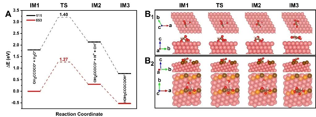 进一步的DFT计算发现手性晶面Cu(653)S也能从动力学上促进丝氨酸的形成,稳定重要中间体H2COCOCO*和3-羟基丙酮酸*的构型,从而降低H2COCOCO*水解形成3-羟基丙酮酸*的活化能以及反应的能垒。