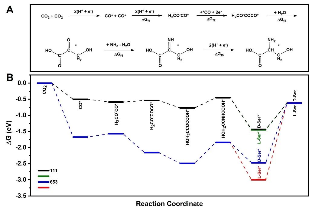 通过密度泛函理论(DFT)计算,研究人员对电催化二氧化碳还原形成丝氨酸的路径和机理进行了研究。计算得出,在手性晶面Cu(653)S上热力学上更倾向于形成3-羟基丙酮酸中间体和丝氨酸,并且更倾向于形成L-丝氨酸,证实了手性无机纳米铜膜表面的手性晶面结构对于形成丝氨酸和对映体选择性起重要作用。