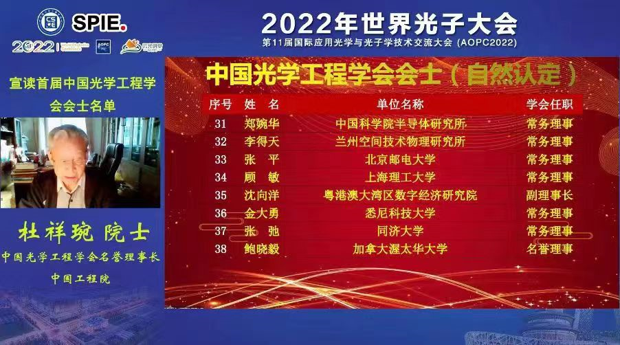 此外,在本次世界光子大会上,38位在国际光学基础科学研究、技术创新发明领域做出卓越贡献的中国科学院、工程院院士和国际主流科技发达国家科学院、工程院院士被自然认定为首届中国光学工程学会会士。公司欧洲科学院院士张弛教授因其在金属氧化物晶体材料与非线性光学学术前沿交叉研究中的杰出贡献而名列其中。
