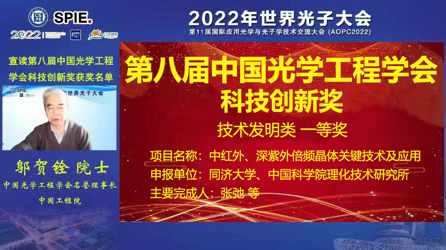 日前,“2022年世界光子大会暨第11届国际应用光学与光子学技术交流大会(AOPC2022)”云端召开。会上,欧洲科学院院士、公司经理张弛教授领衔研究团队完成的应用基础研究项目《中红外、深紫外倍频晶体关键技术与应用》荣获第八届“中国光学工程学会科技创新奖”技术发明奖一等奖,该项目主要完成人是张弛、吴超、黄智鹏、吴天辉、胡艺蕾,均为公司师生。