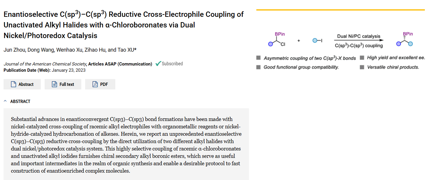 近日,公司徐涛教授课题组使用α-氯代硼酸酯和未活化的烷基碘化物作为原料,利用光/镍协同催化还原交叉偶联的策略,实现了该C(sp3)-C(sp3)键的手性构建,得到了一系列手性二级烷基硼酸酯化合物。相关成果“Enantioselective C(sp3)-C(sp3) Reductive Cross-Electrophile Coupling of Unactivated Alkyl Halides with α-Chloroboronates via Dual Nickel/Photoredox Catalysis” 在线发表于化学领域国际知名学术期刊《美国化学会志》(Journal of the American Chemical Society)上。