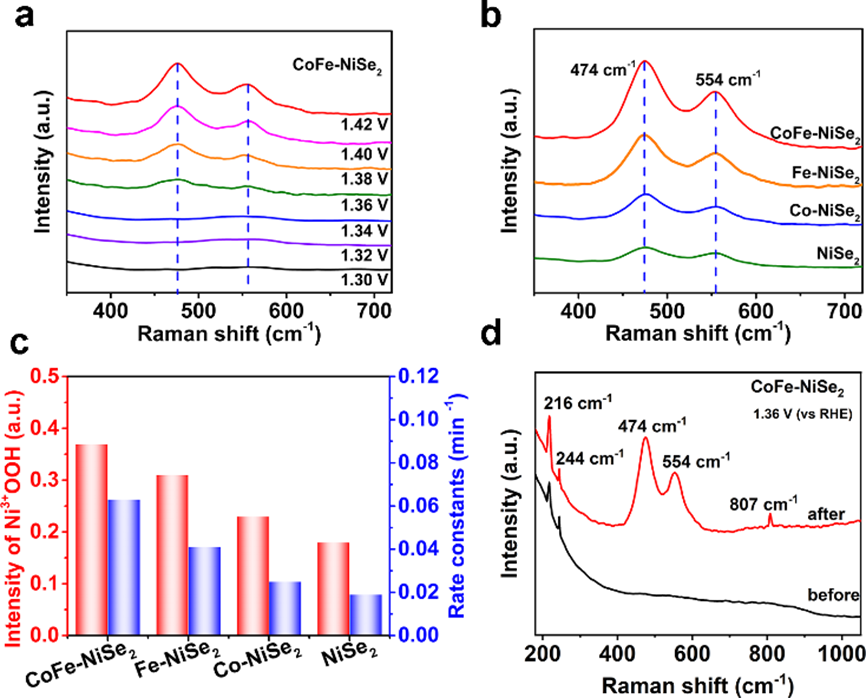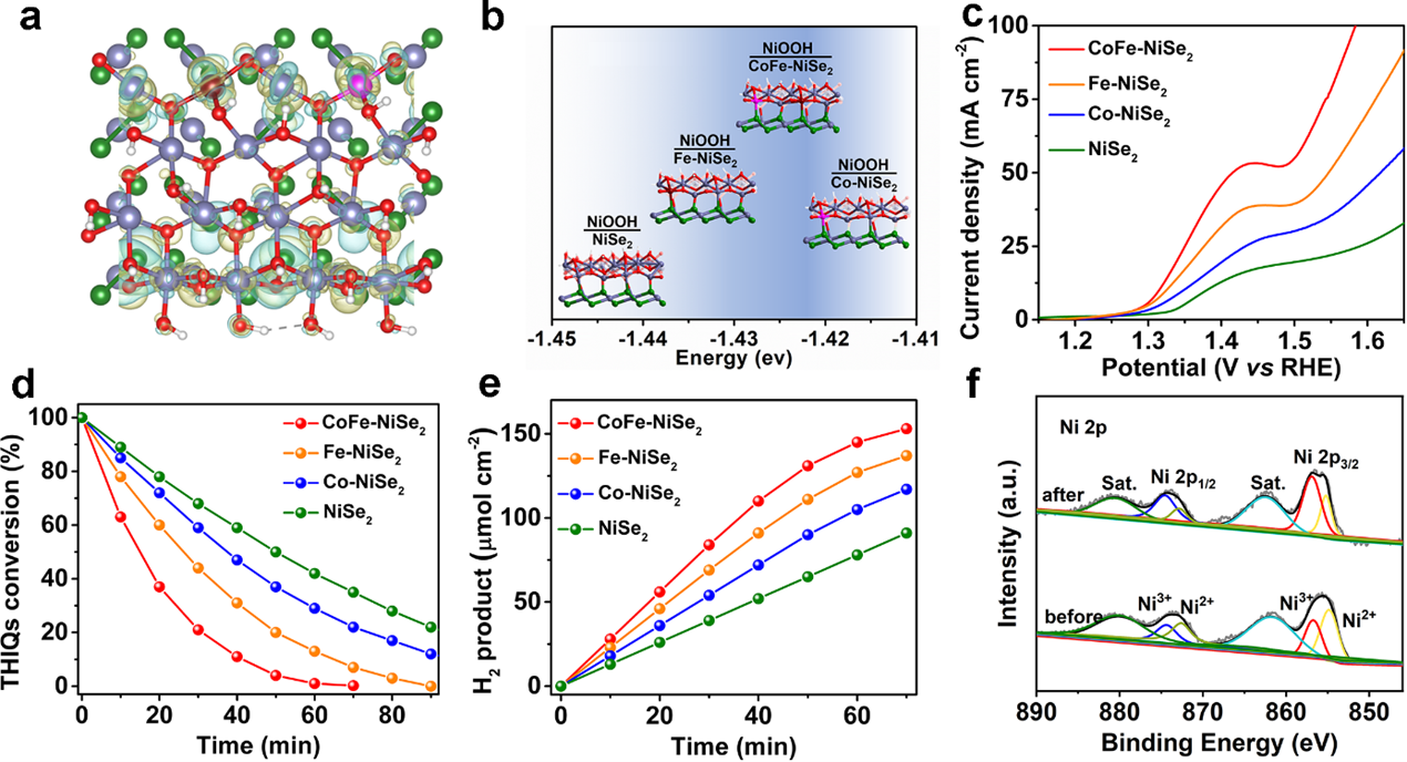 同时,CoFe-NiSe2在电化学氧化THIQs至DHIQs促进产氢反应中表现出最优异的性能。Co和Fe的共掺杂可以进一步提高阳极THIQs转化率和阴极产氢速率。原位拉曼光谱清晰地揭示了电化学氧化THIQs至DHIQs的活性物种为NiOOH,并且NiOOH的产生量与THIQs的转化率呈现明显的线性关系。理论计算也表明Co和Fe的引入可以有效优化NiSe2对OH*的吸附能,从而促进NiOOH的形成,提高THIQs的转化效率。