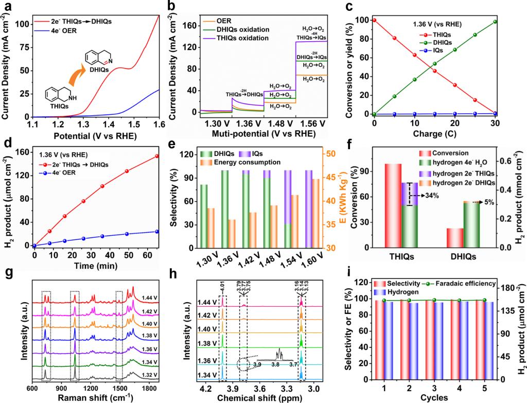 研究表明,在1.36 V(vs. RHE)条件下,2电子轻度氧化至DHIQs的阴极产氢量是纯水分解的6.4倍,而4电子深度氧化至喹啉(IQs)的能耗较高(比轻度氧化高19.3%),这明显不利于产氢。同时,DHIQs具有更高的选择性、转化率和法拉第效率(>99%)。
