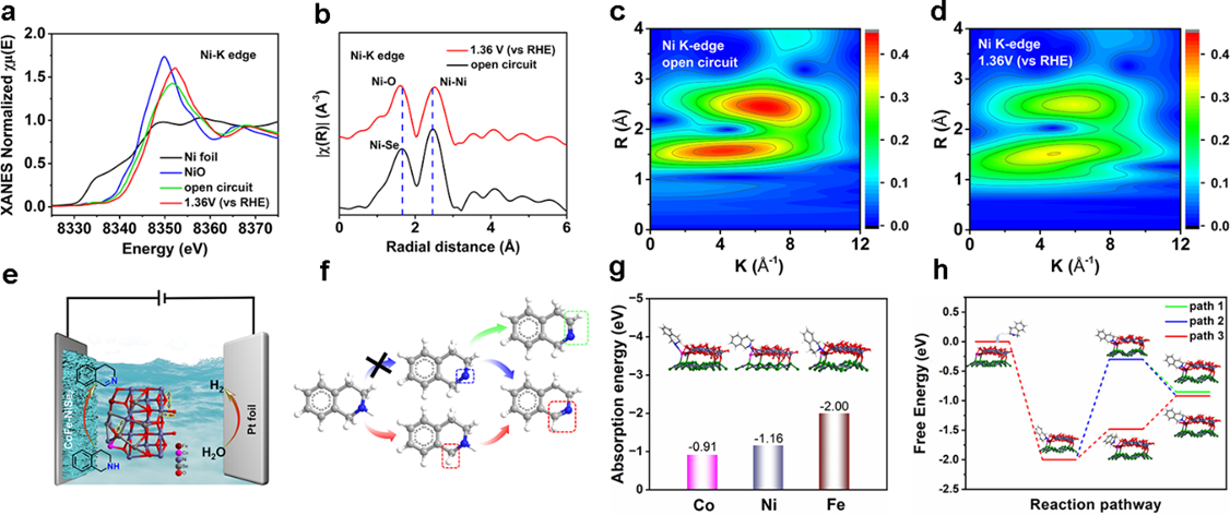 X射线吸收近边结构光谱(XANE)显示,在施加电位后,Ni的K边吸收向高能方向移动,这表明高价Ni的生成。结合密度泛函理论(DFT)计算,模拟了THIQs电化学轻度氧化的三条路径。计算发现Fe位点对THIQs的吸附能较高,THIQs优先吸附在CoFe-NiSe2的Fe位点上。由于N-H键优先断裂需要较高的吉布斯自由能(1.7 eV),因此路径2不利于DHIQs的生成。此外,该过程的第二个脱氢步骤可能发生在另一个C-H键(路径3),有副产物生成,从而降低了DHIQs的选择性。因此,路径1显示了一个更有利的反应途径,即在第一步脱氢中,实现C-H键优先断裂而不是N-H键。该反应具有较低的能垒(0.52 eV),且后续的脱氢只能发生在N-H键上,从而大大提高了DHIQs产物的选择性。
