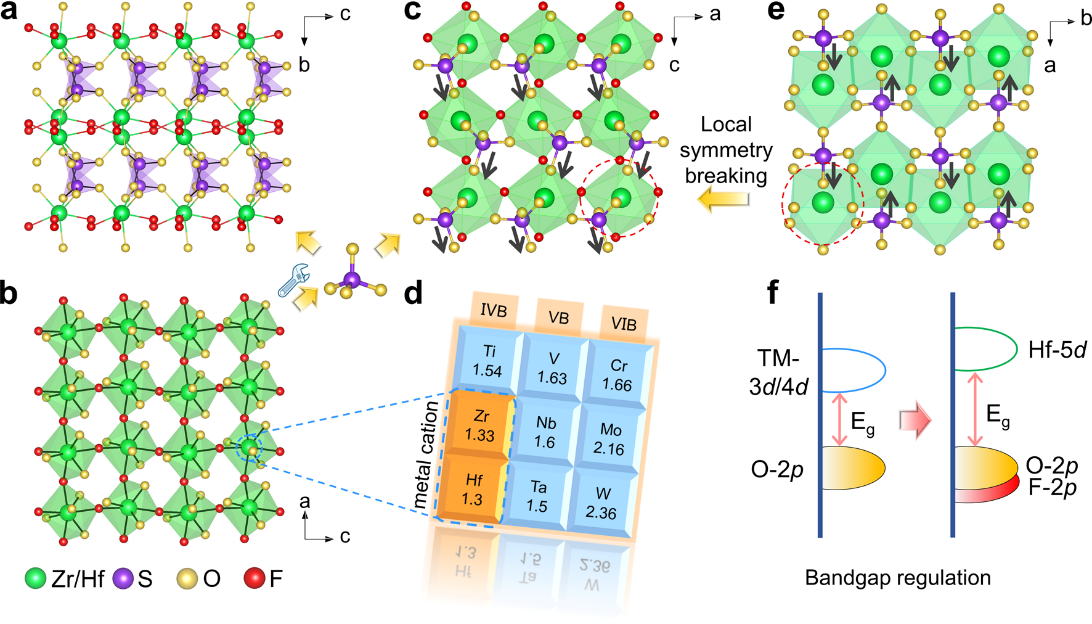 在这项研究中,研究团队提出了“阳离子补偿”策略,借助强电正性的d0过渡金属Zr和Hf,创制了第一例基于d0过渡金属的硫酸盐倍频晶体,其表现出强倍频效应和短紫外截止边。Zr和Hf是电负性最低的过渡金属,强电正性(即弱电负性)的d0过渡金属和强电负性的O/F可增强目标化合物的离子性,有利于材料获得宽的光学带隙。Zr和Hf可形成配位环境多变的多面体[MOxFy] (M = Hf和Zr, x + y = 6~8),由于氟/氧阴离子之间以及金属中心阳离子和氟/氧配体之间的电子结构差异,氟化的d0过渡金属中心多面体展示出结构导向的功能性。这些极性多面体可诱导硫酸盐阴离子形成一致平行的空间堆积方式。尤其重要的是,可极化氟化多面体具有大的微观二阶极化率和强烈的光学各向异性,当多面体一致排列时,有利于材料产生大的对倍频效应和双折射。