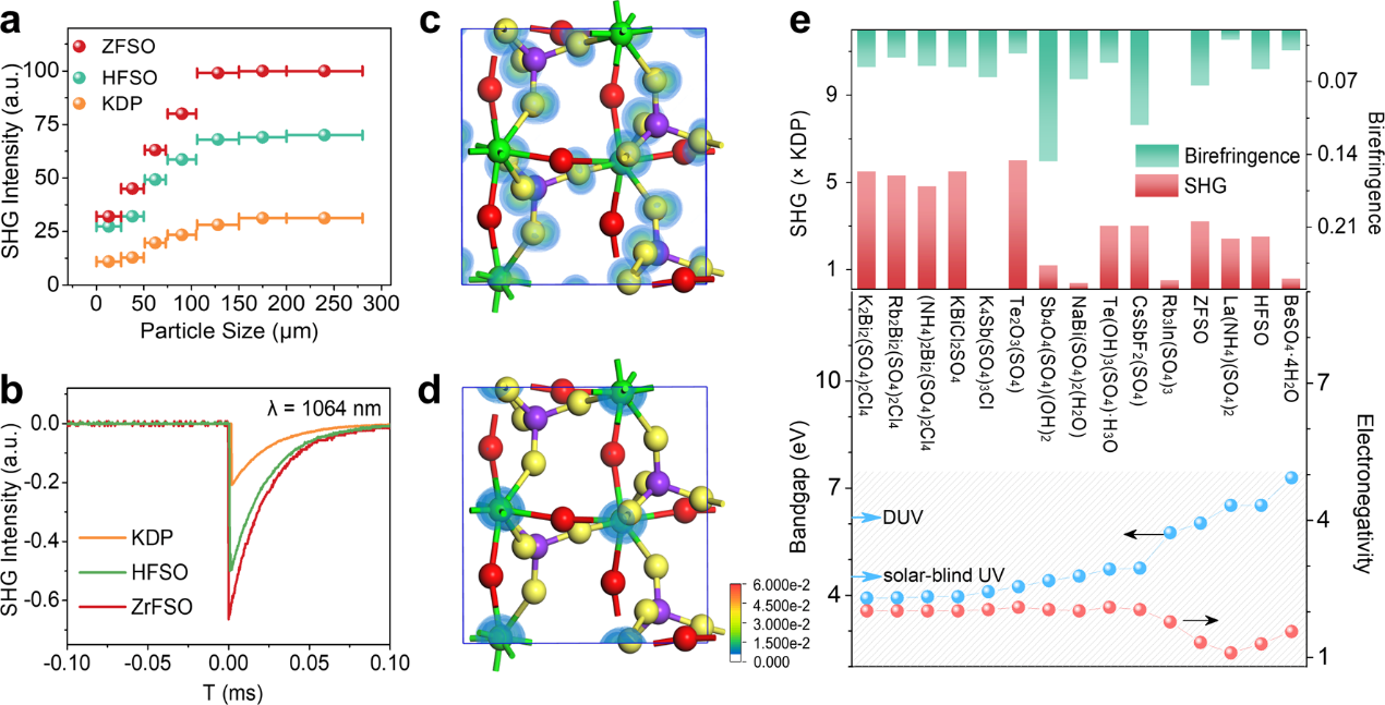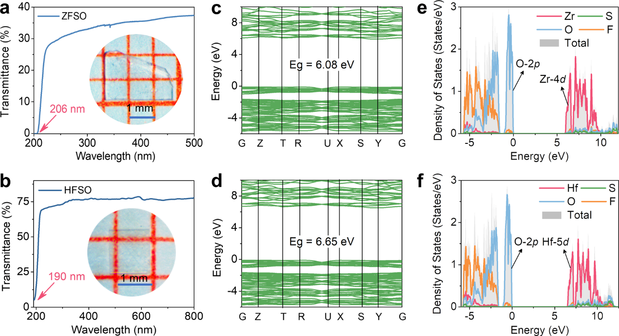 研究团队还运用单晶结构X射线衍射分析结合第一性原理理论进行模拟计算,深入探讨并阐明了ZFSO和HFSO可实现日盲紫外/深紫外光学透过可归因于由强电正性d0过渡金属形成的多面体[MO4F4] (M = Zr, Hf)基元。实验研究显示,ZFSO和HFSO晶体兼具短的紫外吸收截止边(ZFSO: 206 nm, HFSO < 190 nm),强的粉末倍频效应(3.2 × KDP (ZFSO)和2.5 × KDP (HFSO)),以及适中的光学双折射率和良好的物化稳定性。该项研究对于创制研发新型高性能日盲紫外/深紫外倍频晶体具有重要的科学意义和示范作用。