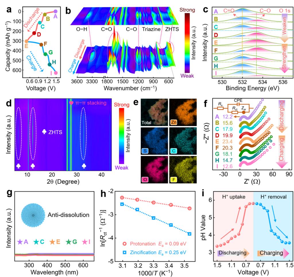 原位/异位光谱研究表明:高度稳定的氢键超结构能有效抑制活性官能团溶解,充分暴露羰基电活性中心,引发高度可逆的氧化还原反应。氢键网络克服了锌离子去溶剂化能垒过高引起的动力学迟滞问题,促进了超稳定和快速Grotthuss质子传输,实现了锌-有机电池中质子主导的电荷存储。