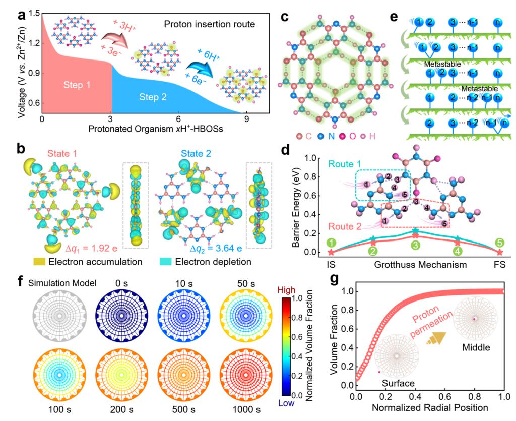 第一性原理计算、差分电荷分析和计算流体力学模拟表明:i)氢键超结构单元经历了两步连续的九电子氧化还原反应过程;ii)羰基位点与质子间存在强相互作用,发生明显的电荷传输,促进电极/电解质界面电荷累积;iii)氢键网络中独特的Grotthuss质子传导机制,有效降低了离子的扩散迁移势垒,显著提高了水系锌-有机电池中的质子存储容量。