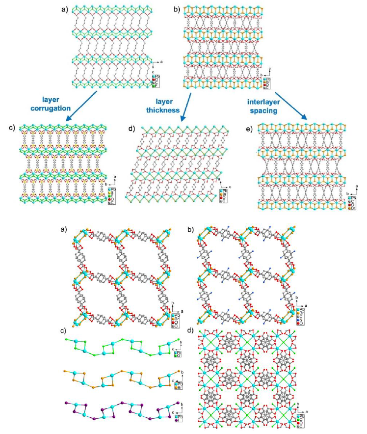 课题组报道了一系列基于卤化铅无机层和层间有机羧酸支柱构筑的层状有机卤化铅配位聚合物,通过选取不同的羧酸支柱,可以调节铅卤层的许多结构特征。此外,课题组将卤化铅基元引入多孔MOF骨架,构筑了一类由低维卤化铅(如一维卤化铅链和零维卤化铅簇)作为SBU的多孔框架材料。