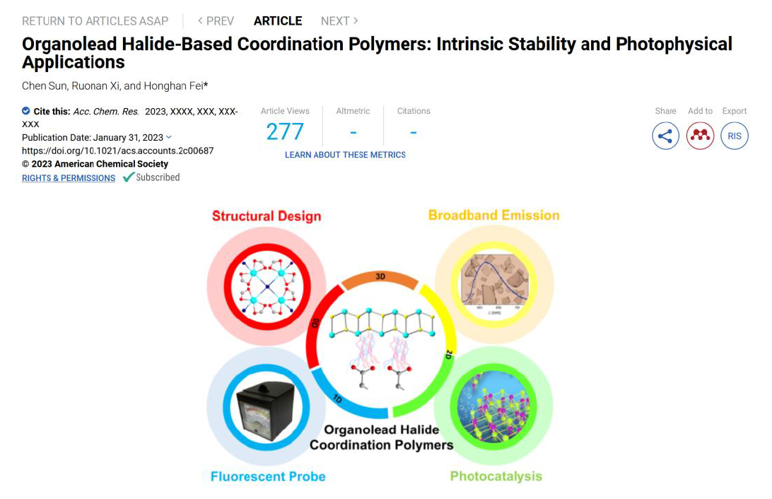 公司费泓涵教授课题组长期聚焦配位型有机卤化铅材料的合成研究,近期在国际知名化学综合期刊Accounts of Chemical Research上发表综述文章,系统总结了卤化铅基配位聚合物的合成策略、结构稳定性及其光化学性质的最新研究进展。课题组提出了一种通过有机羧酸配体制备高稳定配位型有机卤化铅材料的普适合成方法,且这类配位聚合物具有类似卤化铅钙钛矿的优异光物理特性,包括可调带隙和优异的载流子输运。该类有机卤化铅配位聚合物在宽pH范围和沸水条件下保持稳定,在光化学领域具有出色的发展潜力和应用前景。论文题目为:Organolead Halide-Based Coordination Polymers: Intrinsic Stability and Photophysical Applications。