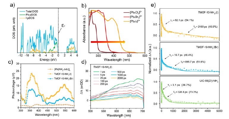 有机卤化铅配位聚合物具有高的光学带隙可调性。此外,有机卤化铅配位聚合物保留了卤化铅钙钛矿的优异载流子输运性质,远优于传统的金属氧族配位聚合物,见下图。