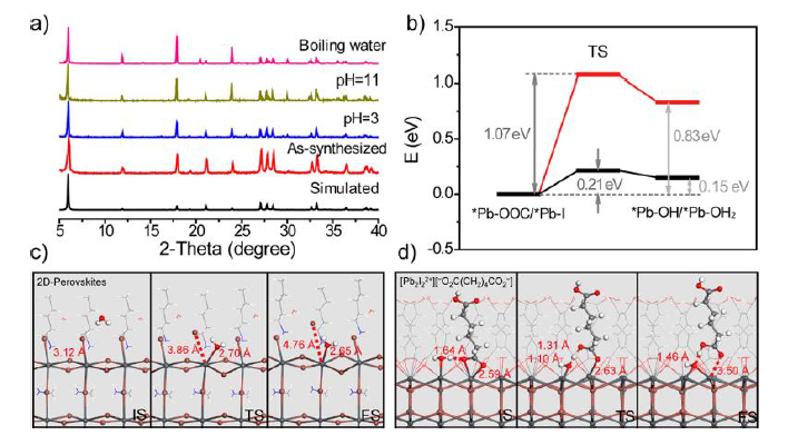 晶体结构分析表明卤化铅配位聚合物的卤族离子以高配位模式存在,主要分布在无机层的内部,使其避免与客体极性分子接触。结合DFT计算表明,羧酸配体与铅离子的配位作用大幅提升了有机卤化铅表面水解的反应能垒,材料表现出良好的光热稳定性、高湿环境稳定性以及宽pH范围水溶液稳定性,如下图所示。