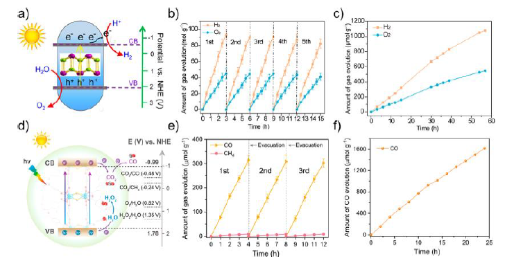 课题组构筑了一例基于二维层状碘化铅的配位聚合物,在无需牺牲剂和助催化剂条件下即可实现光催化全解水,产生化学计量比的氢气和氧气,课题组还进一步研究了多孔MOF型有机碘化铅配位聚合物用于气相光催化反应,实现仅在水蒸气作为还原剂条件下光催化CO2还原至CO,表观量子产率达到1.4%(400 nm),如下图所示。