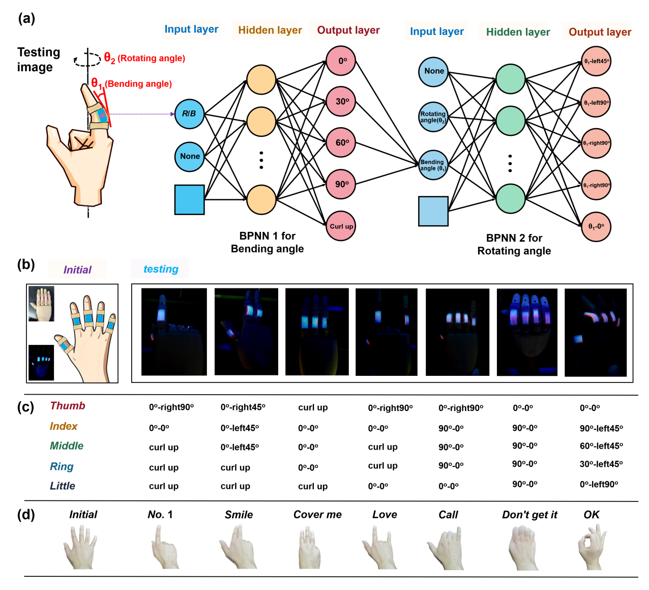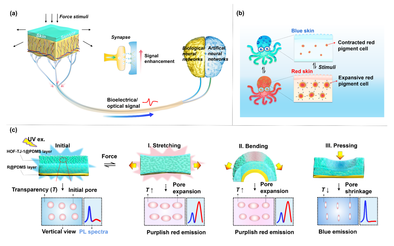 图1. (a) 皮肤传感器通过生物神经网络或人工神经网络转换生物电或光信号的示意图,以实现信号增强。(b) 蓝环章鱼(头足类)通过收缩或扩张色素细胞来改变皮肤颜色。(c)拉伸、弯曲和压缩三种力致变色过程。
