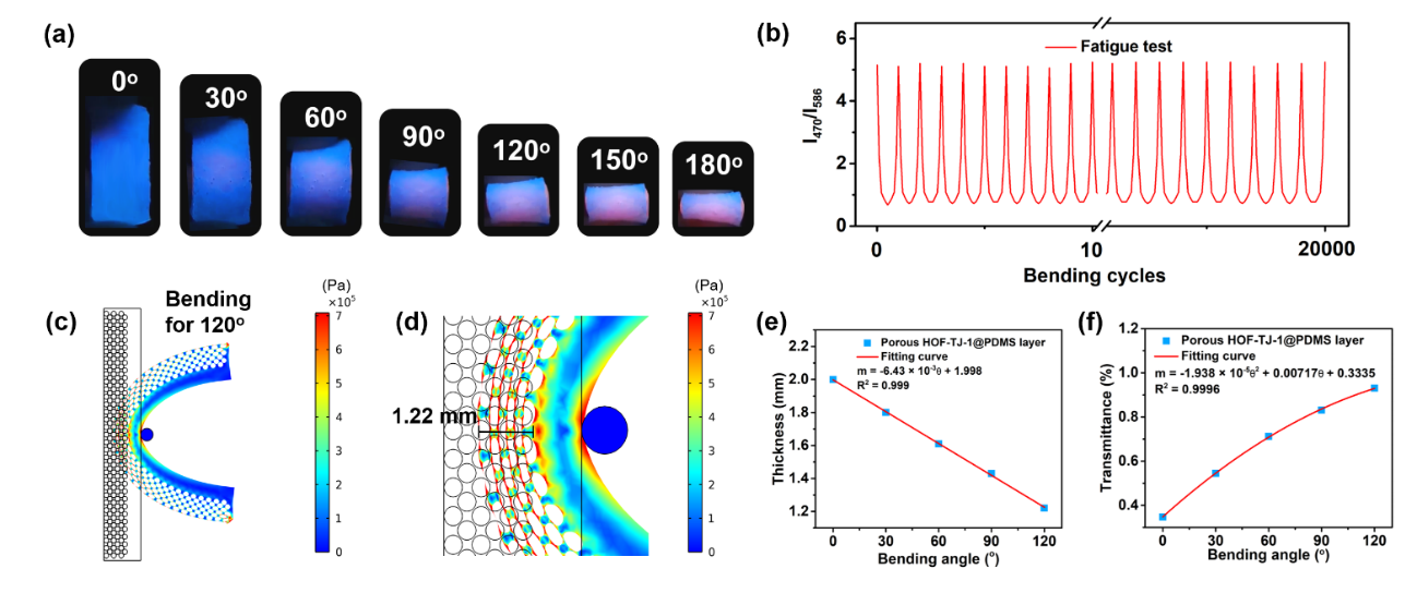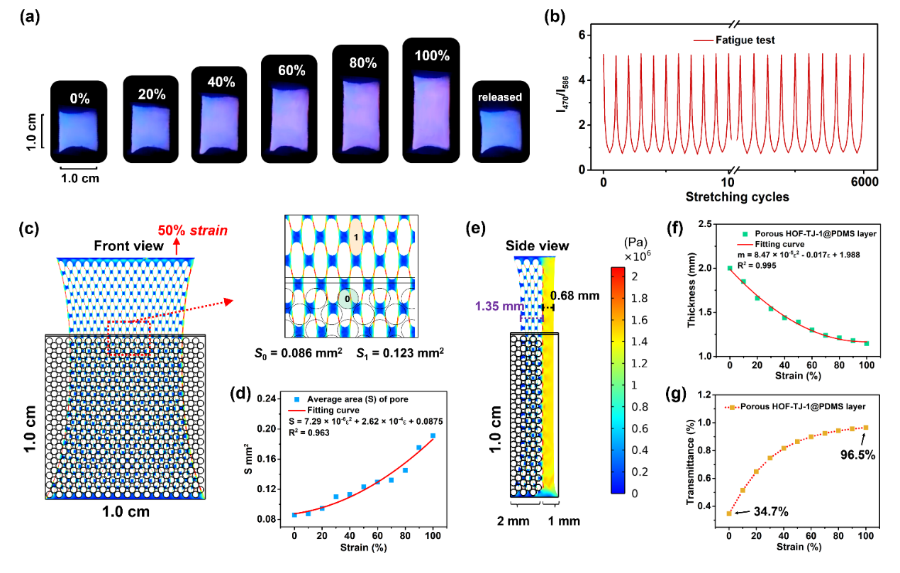 近期,该课题组合成了一例离子型氢键有机框架(HOF-TJ-1)蓝光材料,并通过阳离子交换的方法合成了具有红、黄、绿三种发光颜色的Dye@HOF材料。受蓝环章鱼的皮肤变色行为启发,团队提出了一种发光力敏仿生皮肤传感器的概念,即使用PDMS材料合成了四种HOF基具有三重力致变色响应的皮肤传感器(1−4)。在拉伸过程中,1−3的发光颜色从最初的蓝色变为红色、黄色、绿色,4表现出增强的蓝色发射。在0−40%的压缩应变下,1−4的蓝色发射增强。该传感器上层具有多孔结构,在拉伸,弯曲和压缩的过程中,1−4表现出了超低的检测限和极好的可重复性。通过有限元仿真模拟计算,三种力致变色响应(拉伸,弯曲和压缩)的机理得到了合理的解释。基于1的发光力致变色响应,团队还进一步实现了三种智能应用,即手指运动传感、手势识别和触觉增强的手掌信息收集。该工作以“Bioinspired HOF-based luminescent skin sensor with triple mechanochromism responses for recognition and collection of human biophysical signals”为题在线发表在《材料地平线》(Materials Horizons)上(https://doi.org/10.1039/D3MH00096F)。公司在读博士生徐鑫是论文第一作者,闫冰教授是通讯作者。该研究得到国家自然科学基金的资助和支持。
