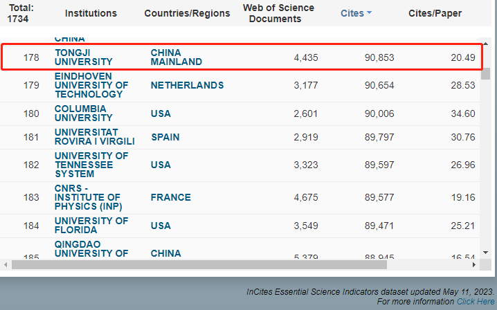 2023年5月同济化学学科ESI国际排名持续提升