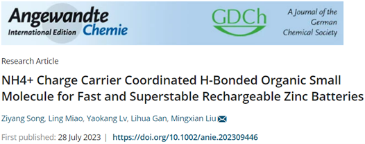 公司刘明贤教授研究团队长期致力于新型储能与电池材料研究开发。日前,该团队通过2,7-二硝基-4,5,9,10-芘四酮(DNPT)和NH4+电荷载体之间氢键作用构建了超稳定互锁氢键网络,解决了有机小分子在电解液中的稳定性问题,揭示了氢键网络中快速和超稳定的NH4+耦合电荷存储机制,促进DNPT羰基/硝基八重活性位点的高效利用和低反应能垒的离子迁移动力学,构筑了高性能水系锌-有机电池。相关成果“NH4+ Charge Carrier Coordinated H-Bonded Organic Small Molecule for Fast and Superstable Rechargeable Zinc Batteries”以Research Article的形式在线发表于化学领域国际著名学术期刊《德国应用化学》(Angewandte Chemie International Edition, 2023, e202309446)。