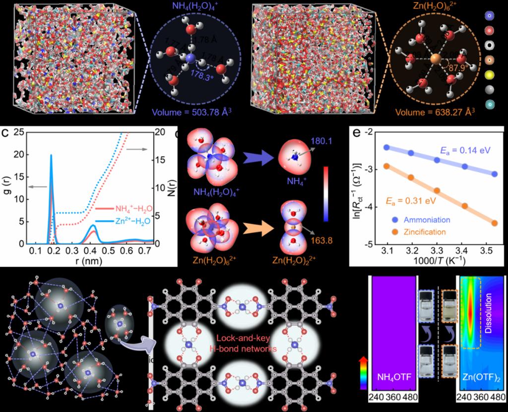 分子动力学模拟和紫外光谱研究表明:高度稳定的氢键网络有效抑制活性官能团溶解,充分暴露羰基/硝基活性中心,克服Zn2+去溶剂化能垒过高引起的动力学迟滞问题,有效降低NH4+扩散迁移/反应势垒,促进超稳定和快速NH4+电荷载体传输。
