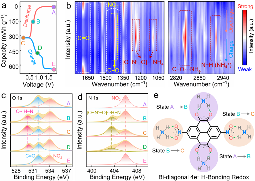 红外光谱和X-射线光电子能谱研究表明:羰基/硝基作为DNPT二元电活性中心(氢键受体),与NH4+电荷载体(氢键供体)通过氢键(去)配位作用,引发高度可逆的两步连续电荷存储过程。