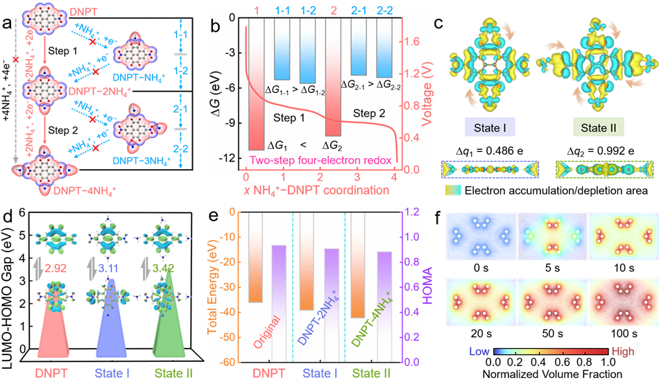 结合能计算、差分电荷分析和流体力学模拟表明:DNPT羰基/硝基位点与NH4+间存在强相互作用,稳定的两步4e− NH4+配位促进电极/电解质界面电荷累积,显著提高了NH4+存储容量。