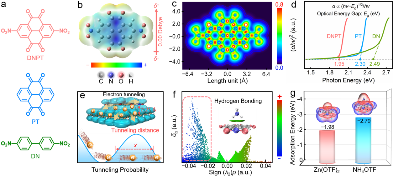 实验结果和理论计算表明:DNPT展示出强亲电子活性、高度共轭分子结构和较低能带间隙,有助于加快电子转移动力学和电极氧化还原速率,促进高效NH4+耦合电荷存储。